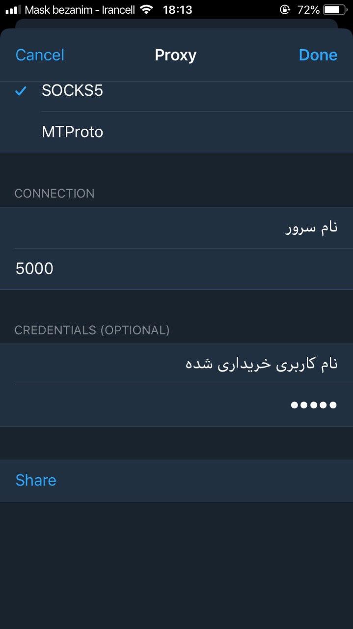 آدرس سرور و نام کاربری و رمز عبور را وارد کنید و گزینه Done را انتخاب کنید