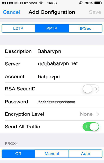 Setting—General—NetWork—VPN—Add VPN Configuration—PPTP